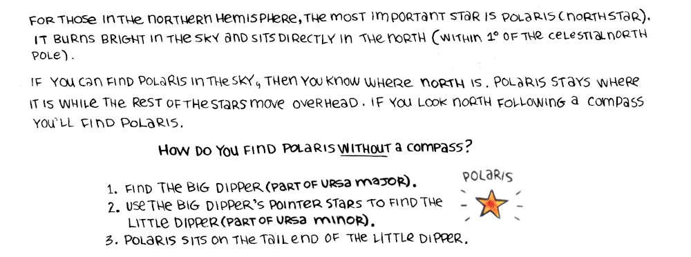 For those in the northern hemisphere, the most important star is Polaris(North Star). It burns bright in the sky and sits directly in the north (within 1 degree of the celestial north pole).