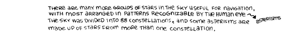 There are many more groups of stars in the sky, useful for navigation, with most arranged in ptterns recognizable by the human eye(asterisms). The sky was divided into 88 constellations, and some asterisms are made up of stars from more than one constellation.